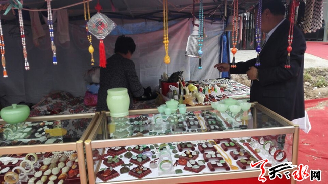 天天天水网9日9时讯【记者 张文都 】 今年受经济运行下挫影响,各行业出现消费低迷行情。5月9日,在秦州区岷山路金家庄附近,一新开张的展销会上,琳琅满目的玉器闪烁着晶莹剔透的光芒。然而,“待字闺中”的玉器买者寥寥,低迷的行情让商家深感“商场如战场”的要义!