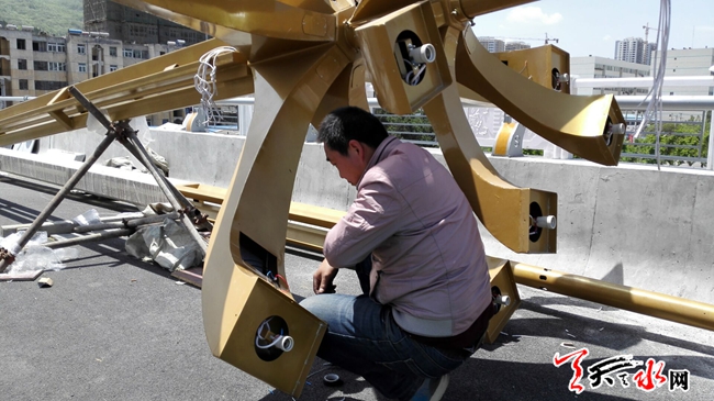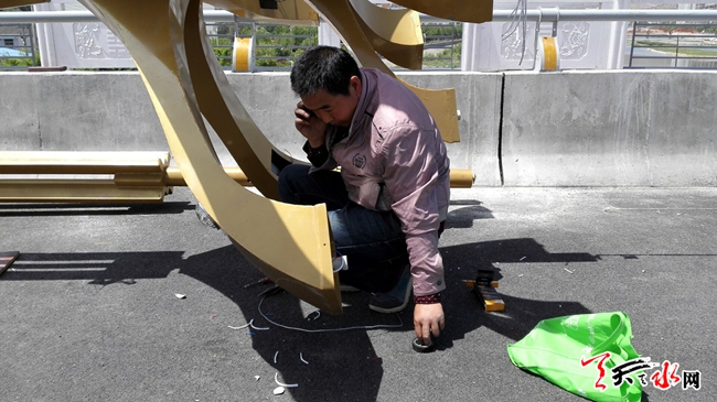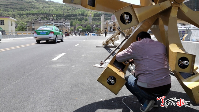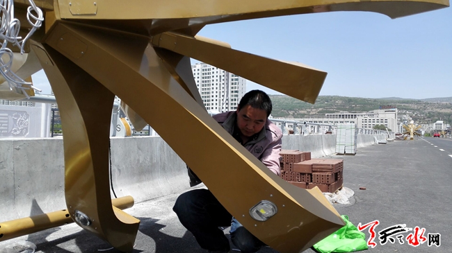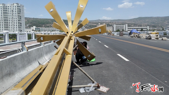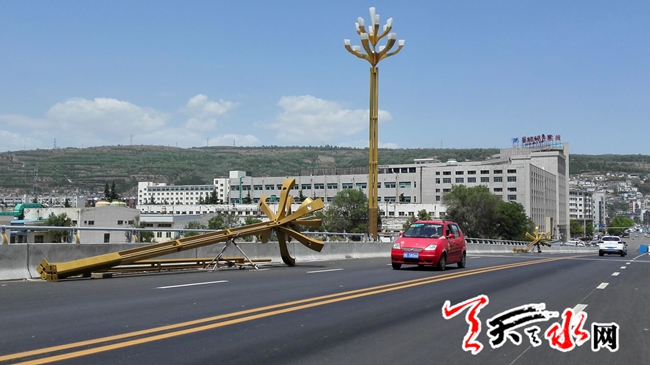 天天天水网9日12时讯【记者苏中豹】5月9日中午,在藉河双桥大桥上,艳阳高照,车来人往。桥面上倒置着多杆待装的路灯,有工人正在灯脚架边紧张忙碌着,已有至少1杆路灯安装到位。