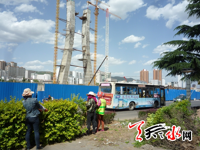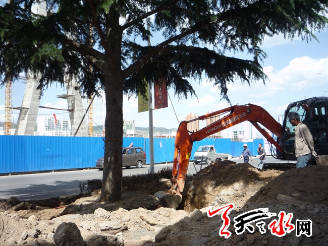 天天天水网9日19时讯【记者 蔚军平】5月9日下午,记者在秦州区藉河南路天水电大附近看到,秦州区园林处的施工人员正在对栽植于道路南侧的行道树等绿化树木进行移植,为正在建设中的南接天庆路的藉河大桥引桥施工“让路”。