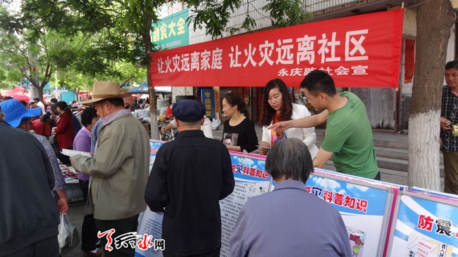 天天天水网讯 2016年5月5日上午,西关街道永庆路社区工作者结合今年防灾减灾宣传的主题“掌握防灾减灾知识,保护生命安全”,在坚家河菜市场开展了丰富多彩、群众喜闻乐见的防震减灾科普宣传教育活动。