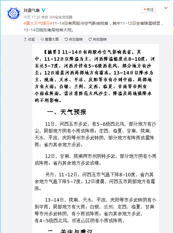 【天水市政府应急办】据甘肃省气象局(5月10日17时)预报:预计5月11—14日,有两股冷空气影响我省,我省有一次大风降温天气过程,我市有小到中雨,局部地方有大雨,受冷空气影响,气温下降5—7度。请各县区和有关部门及时发布预警信息,切实防范局地短时强降水可能引发的山洪、滑坡、泥石流等地质灾害,同时注意防范大风降温天气对交通、农业等行业造成的不利影响。