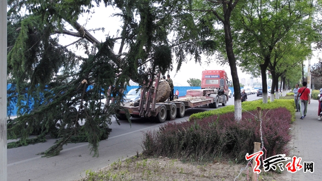 天天天水网11日11时讯 【记者杨旭】5月11日上午,在秦州区藉河南路,三两大型运输车上载着三棵松树由西向东行驶,由于大树枝繁叶茂且体型较大,将整个路面全部“霸占”,造成该路段短暂的交通拥堵。