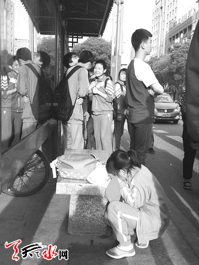 在喧哗的打闹声和烈日的照射下,近日一名小学生抓住等车的空隙时间,趴在秦州区民主路一公交车站石凳上写作业。孩子,抓紧时间学习是好事,但这样对眼睛不好,还得注意呀。(天水日报记者 余碧波 摄)