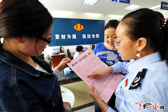 5月11日,天水市地税局重点税源分局的工作人员向纳税户介绍中共天水市委组织部发出的《致全市广大共产党员的一封信》。连日来,天水市地税局机关党委组织全体党员传达学习了这封信,并在重点税源分局张贴宣传,印发给广大纳税户。日前,中共天水市委组织部发出《致全市广大共产党员的一封信》,在全市党员中引起强烈反响。广大党员纷纷表示,将积极响应党中央的号召,结合正在开展的“两学一做”学习教育活动,把“四讲四有”牢记于心,体现于行,在工作和社会生活中充分发挥先锋模范作用,为天水经济社会发展做出积极贡献。(天水日报记者 孙镇 摄)