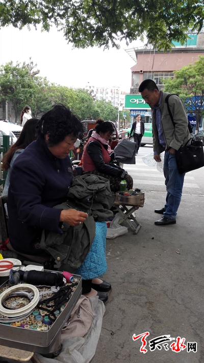 天天天水网12日17时讯 【记者 邵兰霞】5月12日下午,在我市移动大厦附近有一些专门从事手工缝衣的大嫂大妈,年龄在四十岁以上,一把剪刀、几根针线变成了她们手中谋生的工具,她们三个、五个坐在树下,无论严冬、酷暑,手里拿着一根细细的针,在仔细的缝补手中的衣服。