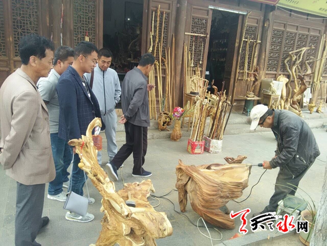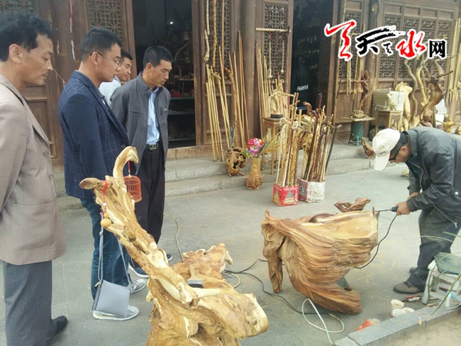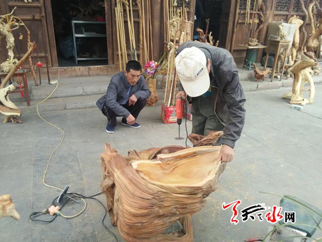 天天天水网12日17时讯【记者 何慧娟 】5月12日下午17时,在伏羲广场的一家根雕店门口,一位师傅正在精心制作根雕,他精湛的手艺和娴熟的技法引来了不少路人的驻足。一个个丑陋不规则的树根经他之手后也变成了精美的艺术品。