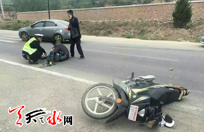 天天天水网5月12日讯【记者 王雪梅】 5月12日19时许,在麦积区麦贾公路吴家崖发生了一起交通事故,一辆黑色越野车与摩托车发生碰撞,摩托车司机头部受伤。高速交警甘泉大队民警立即对现场过往车辆进行指挥疏导。目前,伤者已被送往医院进行救治,肇事车辆等待事故处理。