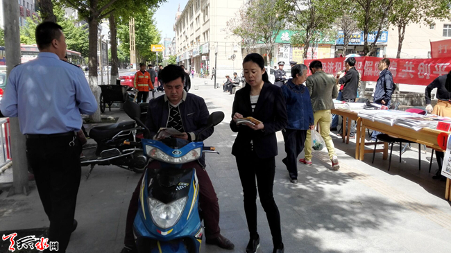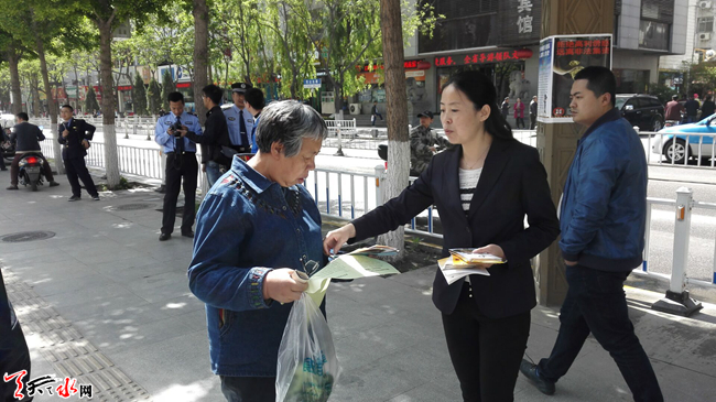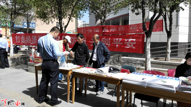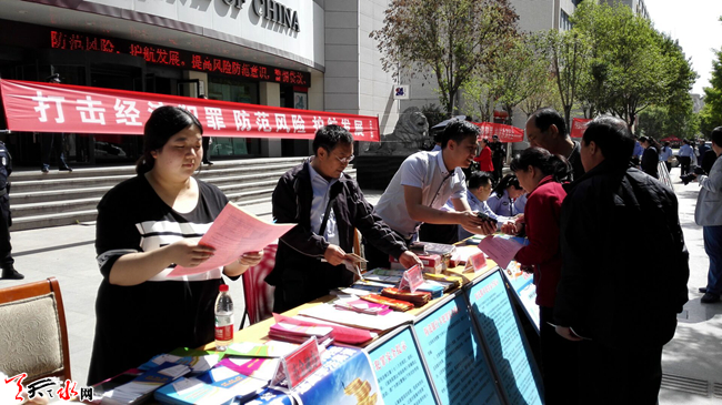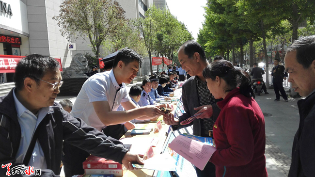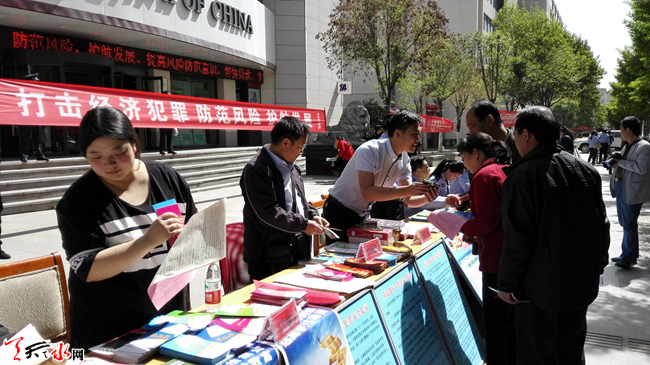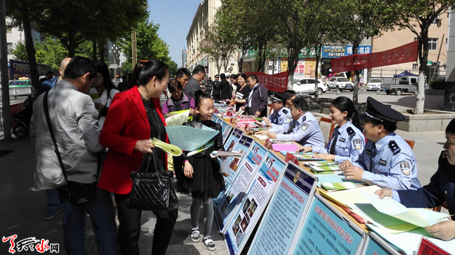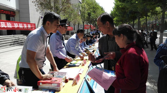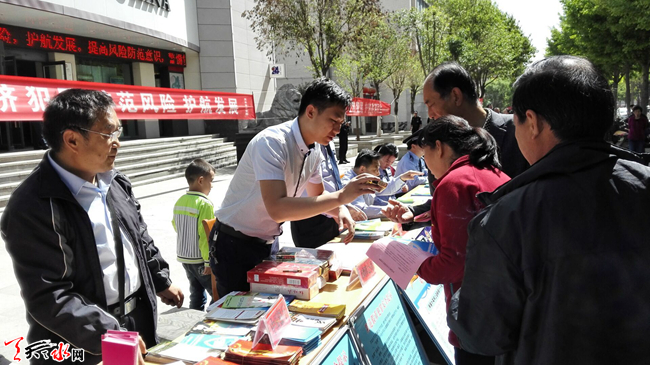 5 月15日上午10时,天水市公安局组织市盐务局、市工信委、市金融办等24家单位,在秦州区民主东路中国银行门前,开展主题为“防范风险 护航发展”的宣传活动。活动重点围绕非法集资、传销、系列合同诈骗等涉众型经济犯罪,揭露常见犯罪手法,展示公安机关打击经济犯罪和护航改革发展的坚定决心,提高群众防范意识和能力,推动社会各界共同参与打击防范经济犯罪工作。天天天水网记者 景春燕 摄