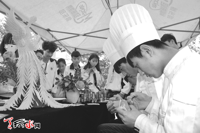 古筝演奏、急救演练、艺术插花表演、剪纸刺绣艺术展示、鼓锤制作、拉面表演、点钞技能展示……在全市职教教育宣传月活动期间,天水市各职业院校在甘肃机电职业技术学院举行职业教育成果展,将课堂搬到现场,通过技能展示向社会公众展示学校职业教育取得的成果,促进大众创业、万众创新,加快现代职业教育发展。(天水日报记者 杨璟 摄)