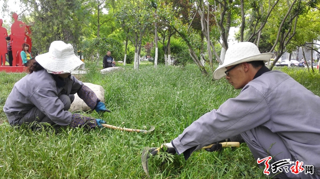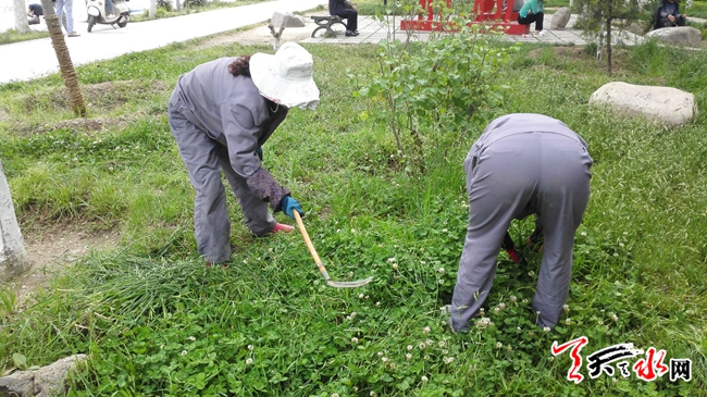 天天天水网16日17时讯【记者 王雪梅】5月16日17时许,在天水湖畔的绿化带工作人员正在清理杂草。天水湖管理处工作人员王淑珍告诉记者,清理杂草的时候他们会留10公分左右,以免地表裸露,影响地表湿度不说而且还不好看。及时清理绿化带的杂草,不但可以预防蛇虫,而且可以确保绿化带的美观。