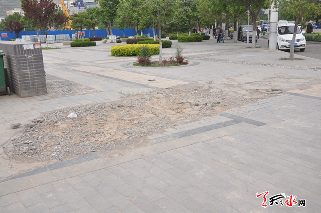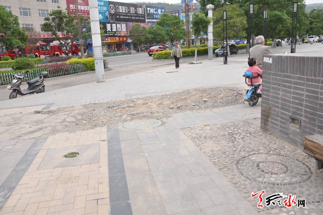 天天天水网17日14时讯【记者 常亮】5月17日中午,记者途经秦州区天河广场时 看到位于天河广场的南侧有较大面积的路面严重破损,而且路面上小石块比较多,在此路过的行人纷纷绕道。