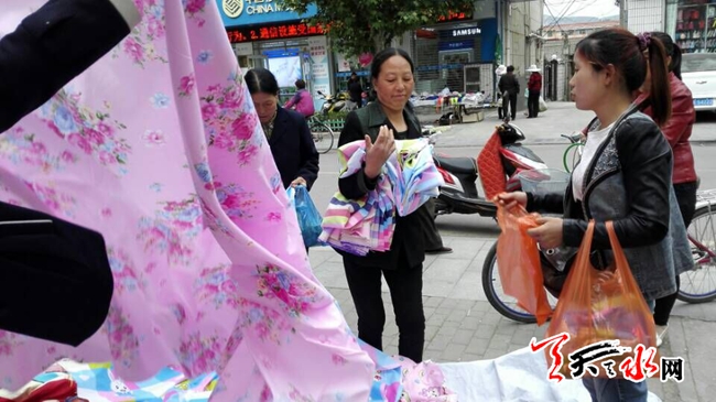天天天水网17日17时讯【记者 文都 永德 杨旭 明辉】 5月17日,在清水县城,一摊贩批发促销的床单虽然价格低廉,但一天成上百条的销售量,也让摊贩看到了数量优势所带来的高额回报!别看小摊小贩街边摆摊买卖挣不了钱,其实依靠薄利多销的交易法则,也能收获丰厚收益。