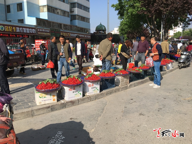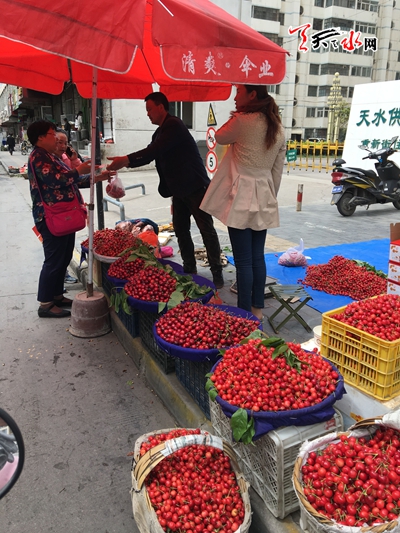 天天天水网18日10时讯【记者甄娜】早上十点,家住秦州区西关的王大妈便赶到重新街给在深圳的儿子选购樱桃,“四五十元一斤的樱桃虽然大,但价格太贵了,还是这种28元一斤的樱桃更实惠一些。”让王大妈感到更为方便的是,往年重新街口虽然卖樱桃的排起了长龙,但还得提到家里打电话找快递员,今年快递就在卖樱桃的旁边,这头一买,那头马上就能邮寄,特别方便。