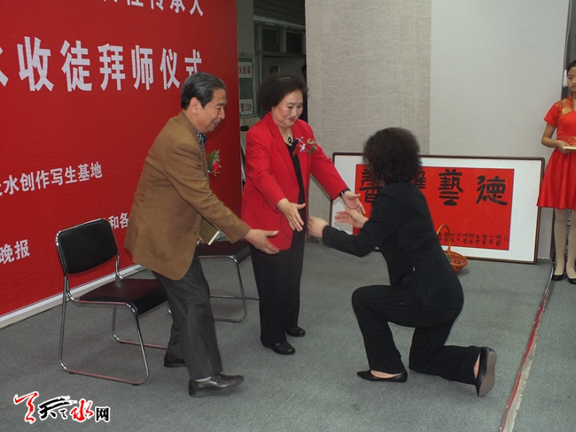5月14日下午,在天水市金龙大厦三楼华夏艺术馆大厅,著名秦腔表演艺术家、国家级非物质文化遗产秦腔项目代表性传承人李爱琴,在200多位嘉宾和秦腔爱好者的见证下接收天水市当红小生贺晓蕙为徒,并举行了传统的拜师仪式。(天水日报记者 何慧娟 摄)
