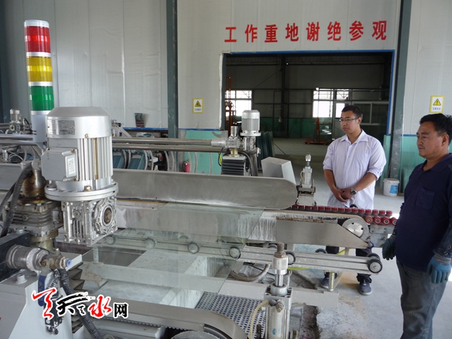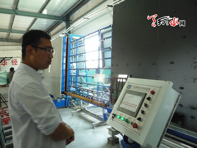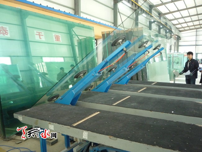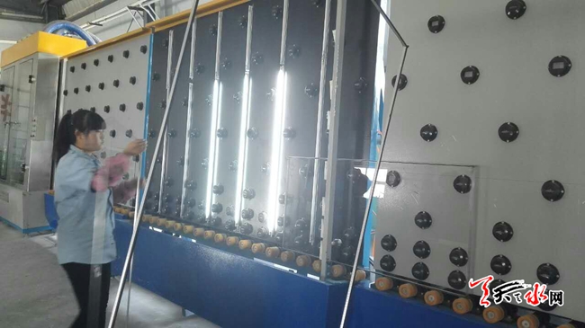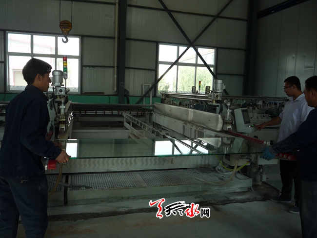 天天天水网18日19时讯【记者蔚军平】5月18日,由天水日报、天水晚报等媒体记者组成了“经济直通车”采访组走进甘谷平光玻璃工艺有限公司。在一条立式全自动中空玻璃板内和片平压生产线上,工人们流水作业有条不紊。剪切后的原片玻璃,经过加工后,最终成为双层的中空玻璃。