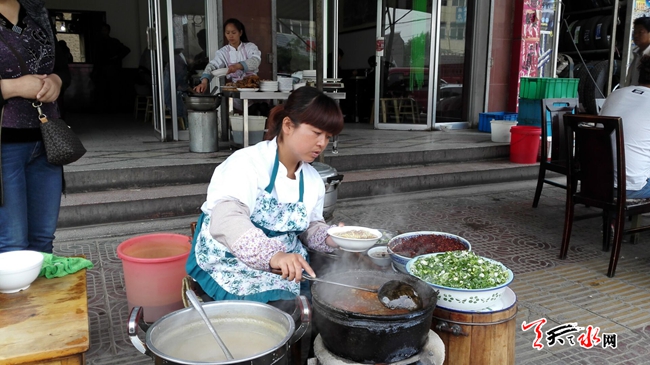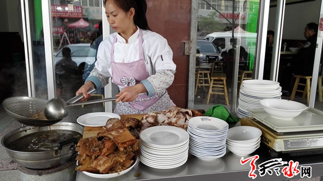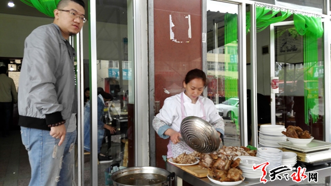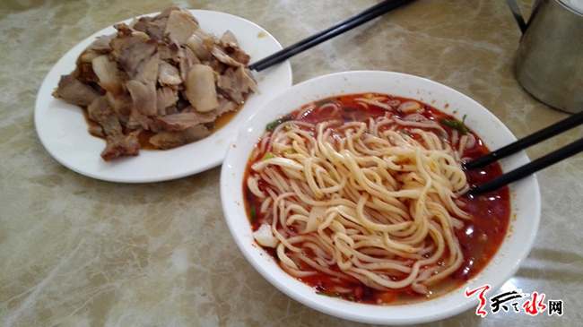 天天天水网19日10时讯【记者 苏中豹】5月19日,武山县洛门镇和县城品尝“薛家臊子面”的人络绎不绝。天水人的一天从一碗呱呱开始,武山人的一天则从一碗热腾腾的臊子面开始,而其中以薛家臊子面最为出名。