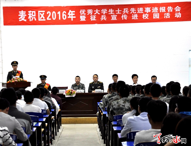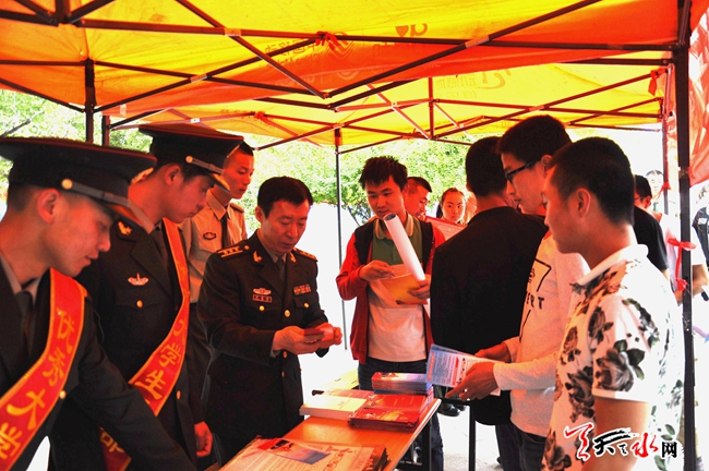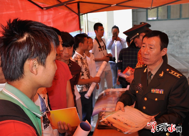 天天天水网19日15时讯 【记者 赵晓玲】5月19日,天水市夏季征兵宣传工作已全面展开。记者了解到,为做好今年夏秋季大学生征兵工作,5月18日,麦积区人武部官兵走进省林业职业技术学院、省工业职业技术学院宣传征兵政策,鼓励广大适龄学生应征入伍。在现场征兵宣传咨询点,大学生踊跃询问,参军热情高涨。并向学生发放《征兵宣传册》。