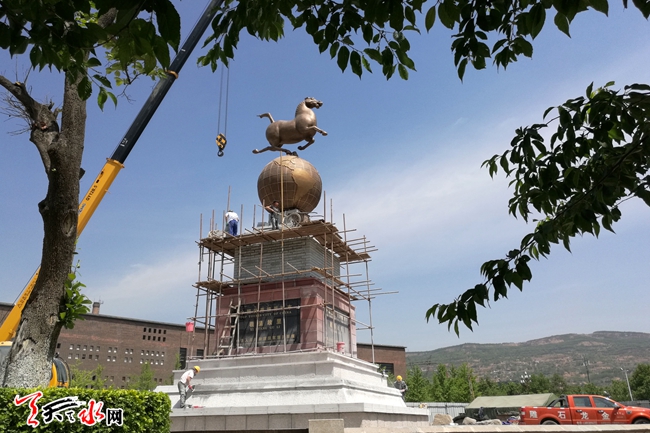 5月18日,工人在秦州区天河广场修建中国优秀旅游城市标志——“马踏飞燕”雕塑。据了解,天河广场“马踏飞燕”雕塑高15.55米,马身高3米,地球球体直径3.3米,均由全铜铸造,烽火台与基座为钢混结构,外部砌筑石材,基座四周配建荷花池,预计将于5月中旬整体完工。此次在天河广场建造“马踏飞燕”雕塑,将进一步提高中心城区城市品位,增加城市亮点。(天水日报记者 周文涛 孙燕芸 摄)