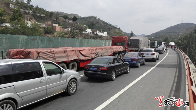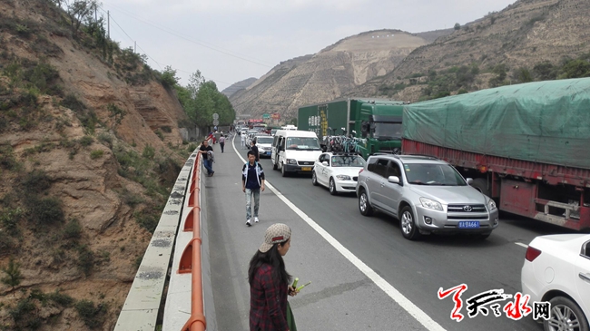 天天天水网20日15时讯 【记者 王雪梅 何慧娟】5月20日下午三点左右,在甘谷通往秦州方向的高速公路上,由于一车辆在秦州隧道内出现故障,道路暂停行驶,造成约两公里长的堵车。截止记者发稿,该方向路段还在禁止通行中。