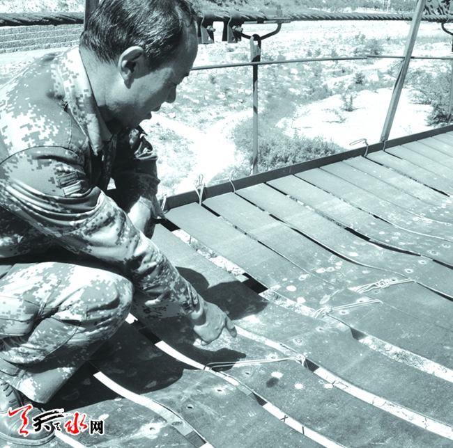 一位村民带着记者来到桥中央,指着刚焊接好的几块钢板对记者说:“前几天几块钢板先后断裂,为了行人及车辆的安全,村干部垫资4000元钱请人焊接了断裂的部分,有时发现有一两块断裂的就用铁丝先捆绑固定一下。2007年,桥的主梁断裂,村上请人进行了焊接,为了保证桥能继续使用,就将原来桥面下的4根主梁增加到6根,就这样年年修修补补维持到现在。”