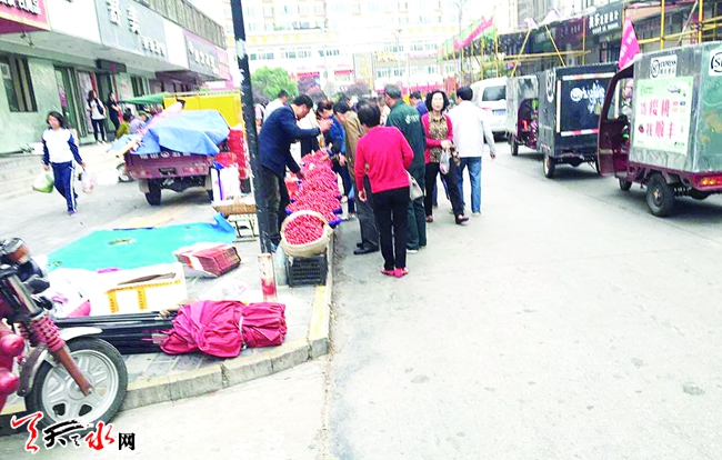 5月21日,记者途经秦州区重新街南口时看到,该路段人行道被当做一个集中售卖樱桃的临时市场,摊贩将樱桃摆在紧挨马路的道牙边,购买樱桃的市民便大量拥挤在马路上,而马路另外一侧还停了不少代理樱桃快递业务的快递车,导致整个重新街交通拥堵不堪,人车通行十分困难。希望有关部门能对这里的樱桃临时售卖区域的秩序加以管理,勿让摊贩和人群挤在马路上,以便其他市民出行。(记者 贾敏 摄)