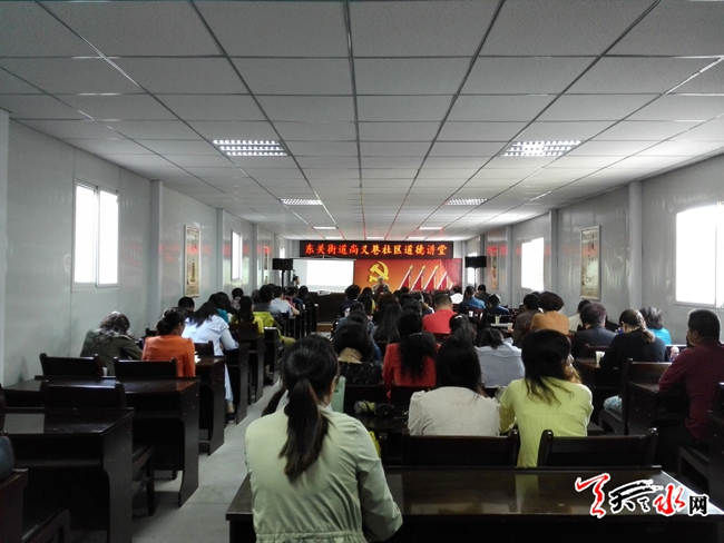 天天天水网24日12时讯 【记者张小龙】5月24日上午,东关街道尚义巷社区举行道德教堂活动,弘扬中华民族传统美德及经典,号召全体社区干部及居民将道德规范内化于心,外化于形,构建崇德向善的社会氛围。