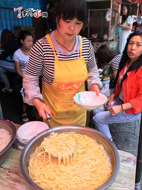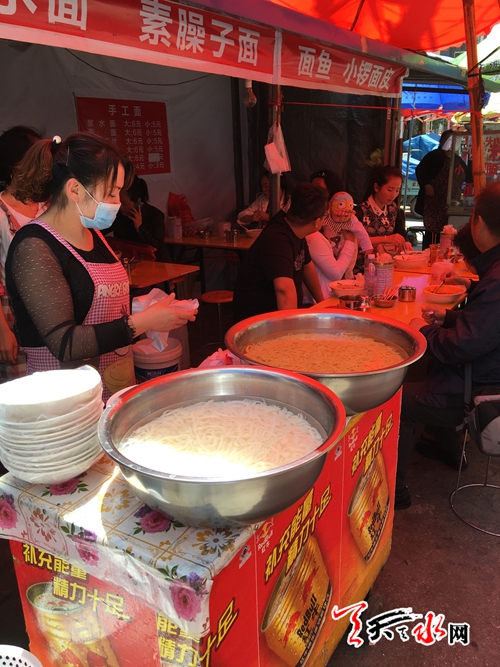 天天天水网24日12时讯【记者甄娜】“只要阳光明媚,来的顾客几乎都是吃面鱼的,如果是阴天,面食要卖的好。”在秦州区官泉路摆摊的刘老板说。这些天,虽然天气忽冷忽热,但是只要天晴,面鱼便成了热卖食品,5元小碗、6元大碗,刘老板说今天天晴,估计能卖出100多碗。