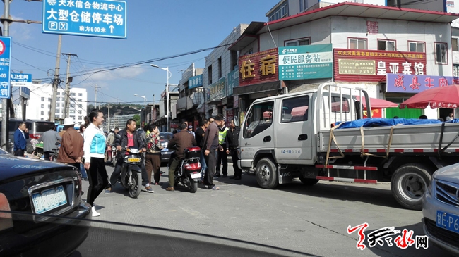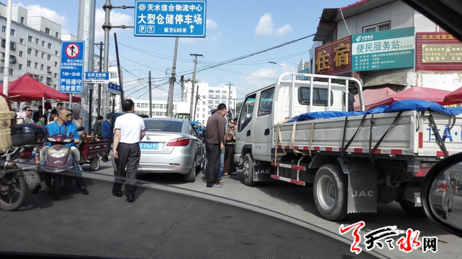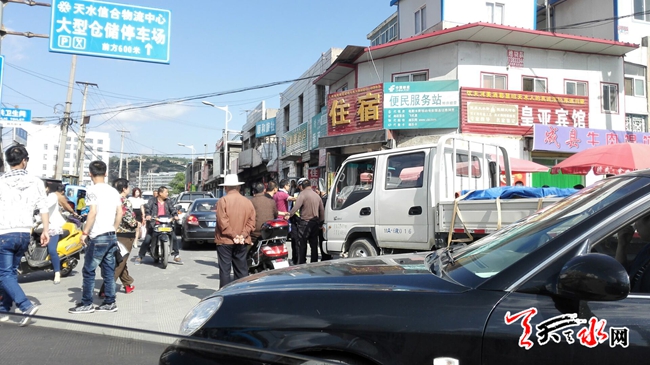 天天天水网24日12时讯 【记者 刘晓亚】5月24日上午,罗玉路东段,由于往来车辆较多,致使道路堵塞,一辆甘A牌照的微货载着一车樱桃欲西去,执勤交警规劝司机暂停等候,司机不听规劝,继续向前移车辆,致便车前站立的交警不得不击打车体,司机下车挥拳打向交警,在路人劝解下殴打未果,司机僵持10分钟左右,见路着实难以通过,才悻悻地离开。