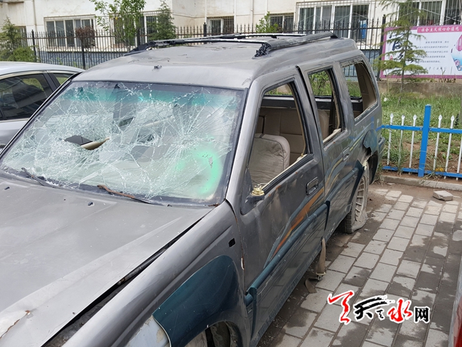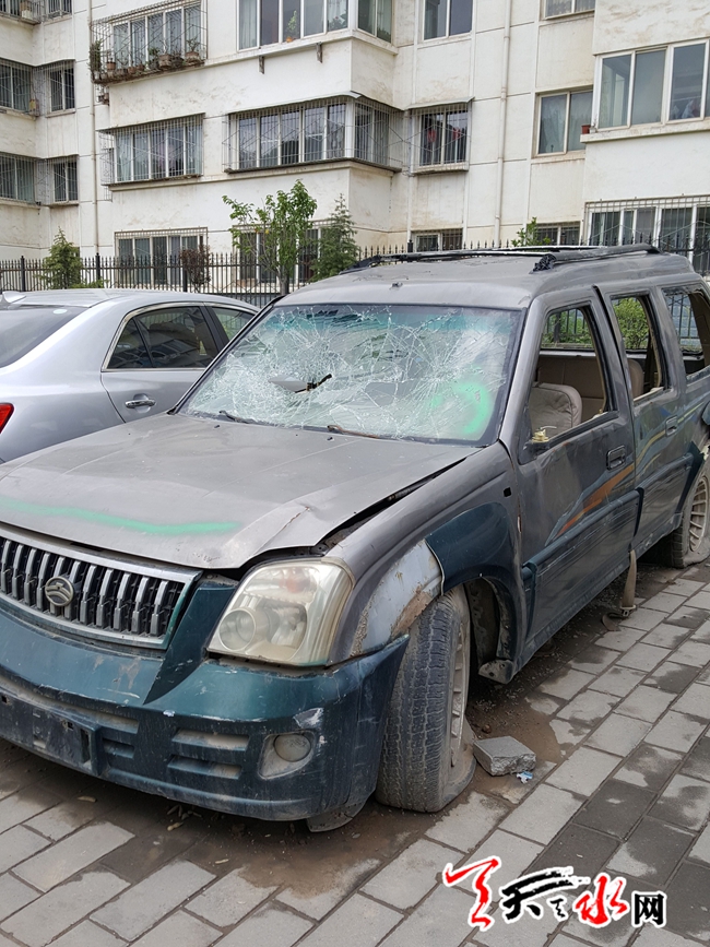 天天天水网27日14时讯【记者 常亮】5月27日中午,记者在秦州区罗玉路西段看到,位于罗玉路西段的枣园小区门前的人行道上 停放着一辆破旧不堪的长城牌小汽车。在现场记 者看到,小汽车的前后轮胎已经泄了气,前挡风 玻璃破碎,车门上的几处窗户均没有玻璃。