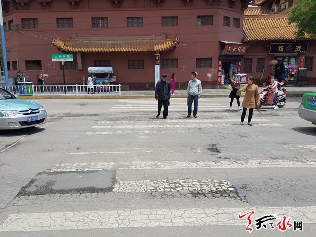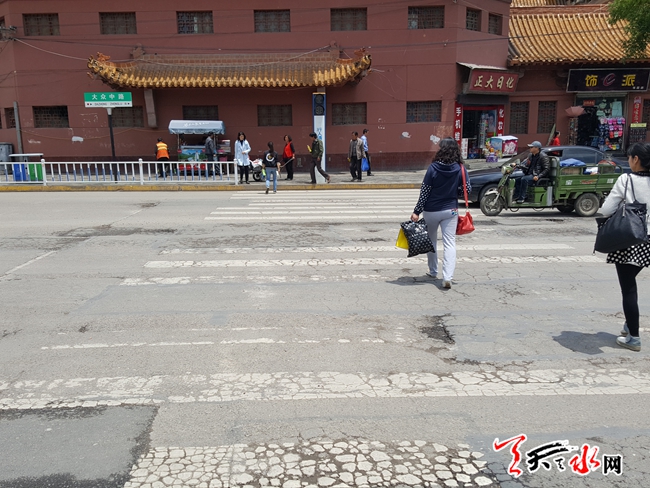 天天天水网27日14时讯【记者 常亮】5月27日上午,记者途经秦州区大众中路发现,位于大众中路北口处路面的斑马线已经消失,而且路面坑洼不平,十分影响市容市貌,
