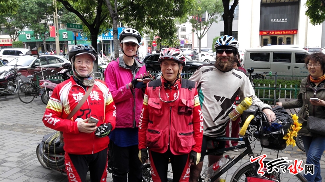 据陪同他们的天水老骑友光年和老顽童介绍:这两位骑友来自英国,已由新加坡、马来西亚、泰国等东南亚一路骑行,然后进入中国。“昨天到达我市,受邀就住在了我家里,吃的是天水面片,至于交流,是由外地学外语的女儿通过手机的交流翻译才了解到这些情况的。”网名叫光年有着古道热肠的老骑友自豪地说。