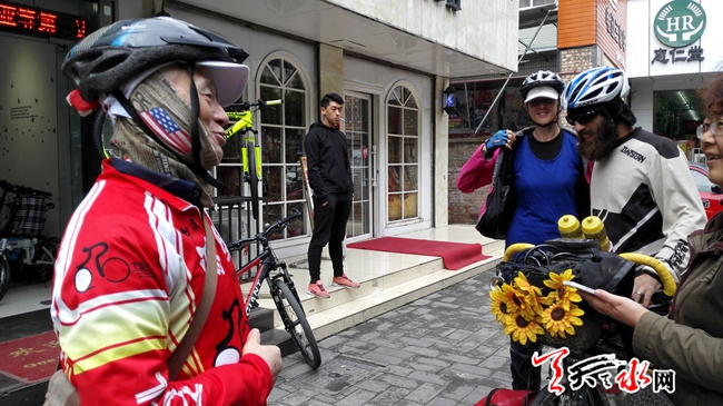 天天天水网27日12时讯【记者苏中豹】5月27日上午,在秦州区解放路育生巷口捷安特自行车店前,一男一女两名来自异国的洋骑友和他们重装的加长双人旅行自行车引起了天水骑友和路人的好奇,大家把两位外国友人围在中间,以各种方式,问长问短。虽然语言不通,大伙还是希望尽可能相互沟通,并想为他们提供帮助。