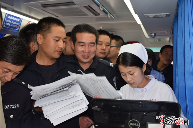 参加无偿的献血民警、文职和协警在天水市中心血站医护人员的指导下,排队进行登记、初筛、化验、采样、采集等环节工作。 最后,全局共有73位民警血液被采集贮存,工作人员现场为他们颁发了《无偿献血证》。