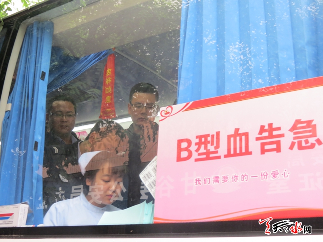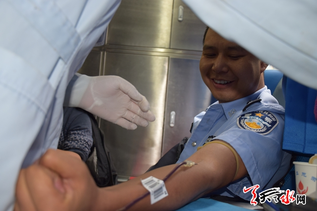 天天天水网讯 【记者 王琳 通讯员 李占军】 5月25日上午,在甘谷县公安局“两学一做”学习教育工作推进会后,由局长柴全明、政委张涛带头,100多名民警、文职和协警参加了全县2016年无偿献血活动。