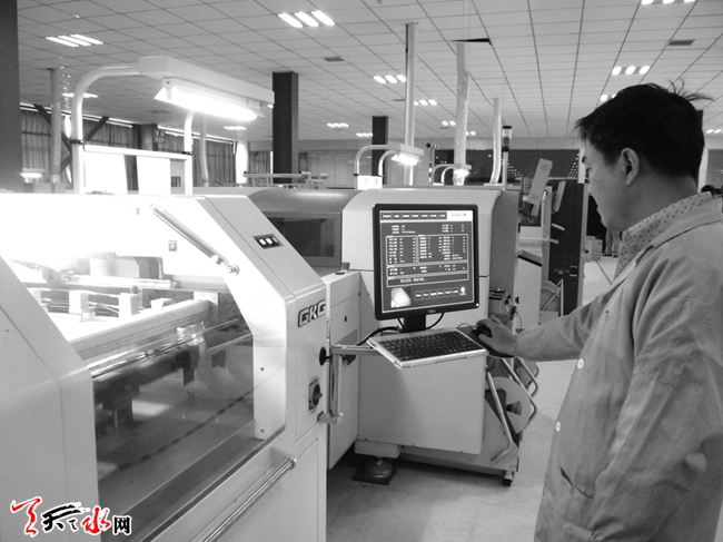 日前,在“明讯通讯产业基地项目”生产车间内,技术人员正在操作电路板表面贴装设备。