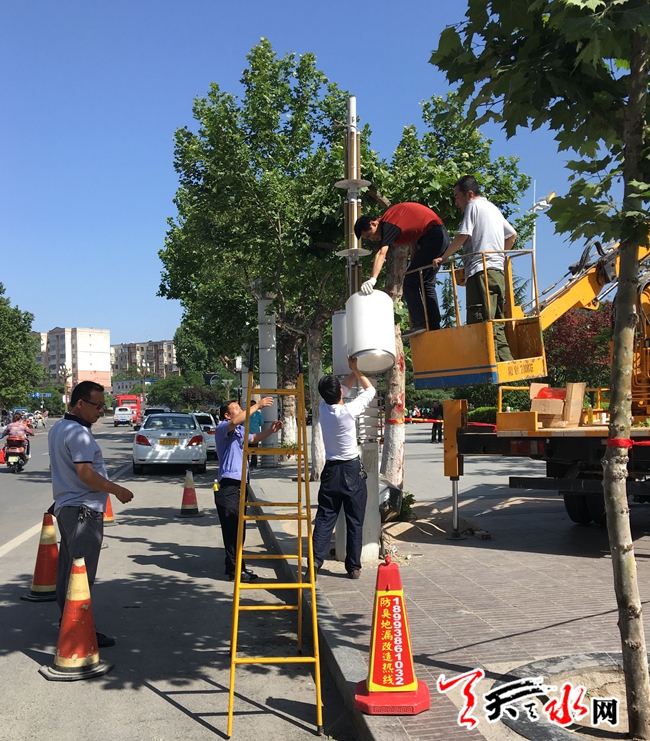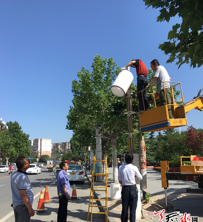 天天水网3日16时讯【记者甄娜】为保证我市伏羲文化节期间的夜晚亮化,天河物业管理公司的工作人员顶着大太阳小心翼翼的维护天河广场的路灯。