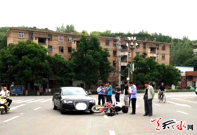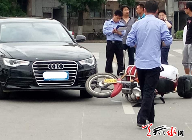 天天水网6日15时讯【记者甄娜】双桥新桥桥头汽车与摩托车又来了次亲密接触,骑摩托车人员被送至医院,交警正在处理事故。天天天水网提醒司机朋友们,谨慎行车!