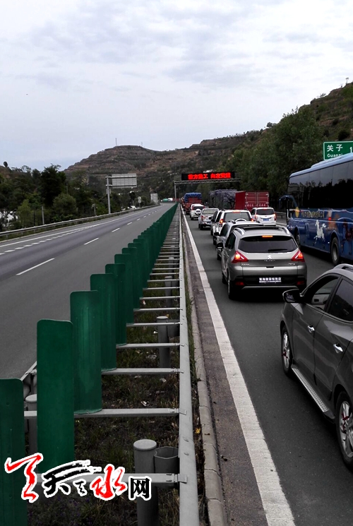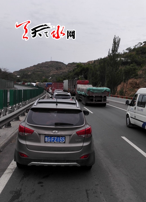 天天天水网6日15时讯【记者杨晓斌】6日18时20分许,天定高速秦州区关子镇段出现轻微堵车,汽车只能走走停停向前挪移,宽敞的高速路宛如停车场。不过从18:34开始,堵车状况有所缓解,车辆可以不用走走停停,可以20公里每小时的速度向前行驶。记者路过时看到,堵车可能是因为道路维修,单边通行引起的车辆阻塞所致。