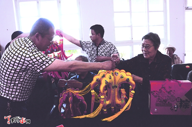 端午佳节来临之际,6月3日,天水市宝鸡商会的企业家带着粽子、荷包、毛巾等慰问品,来到市干休所看望慰问了老红军、老干部,向他们送去了节日的祝福。(天水日报记者 王晓馨 摄)
