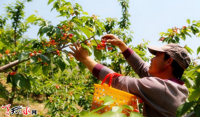 走在乡间的路上,时不时有三三两两的村民,篮子里提着刚摘下的樱桃;走在天水大街上,大樱桃摆满了街头巷尾,拈一颗入口,微酸而又带着甘甜,鲜美无比。