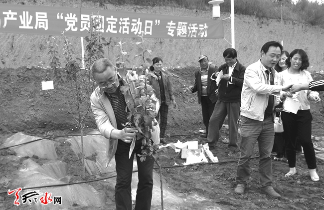 6月4日,麦积区果品产业局党支部组织全体党员深入马跑泉镇利农果品合作社花牛苹果基地,对果农进行果园病虫害防治技术集中培训,让党员在田间地头践行“两学一做”学习教育。特约记者 窦耀辉 摄