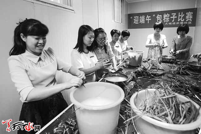 6月7日,秦州区大城街道进步巷社区的居民正在进行包粽子比赛。为进一步丰富社区居民的文化生活,当日,该社区组织辖区部分居民举办了一场别开生面的包粽子比赛。活动以娱乐的方式传承传统的技艺,让居民们切身感受到了端午节浓浓的节日气氛。(天水日报记者 周文涛 摄)