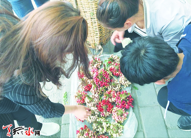 每年芒种节气前后,地处秦岭南麓的秦州区娘娘坝镇以及徽县麻沿等地,满山坡的野草莓便陆续成熟。野草莓当地人称之为莩,有红色和白色两种,白色的味道更加甜美。沿线村民采摘后会上街叫卖,由于采摘莩不易且采摘量不高,一上午采摘的量很快就会销售一空。公路沿线叫卖的一般按篮论价,小篮15元,中等30元,大篮50元。有的村民会把莩扎把后上市区兜售,一把3元。(天水晚报记者 裴婷婷/摄)