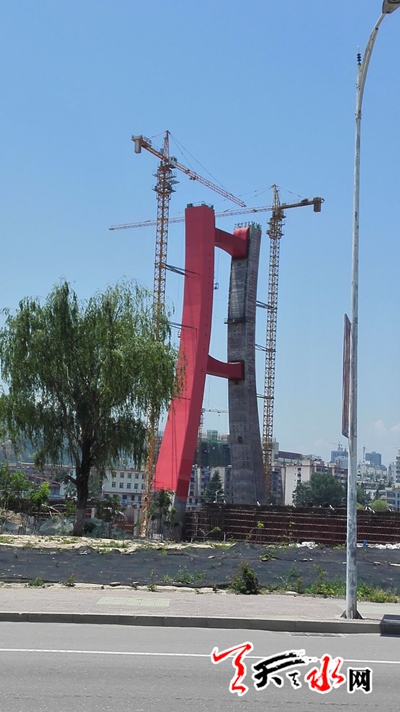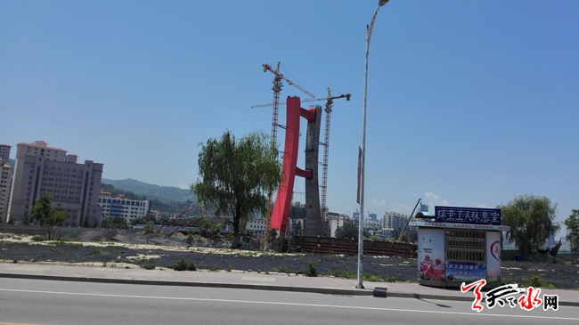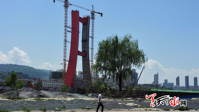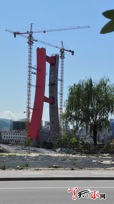 天天天水网12日17时讯 【记者 刘晓亚】 6月12日,藉河大桥桥塔在完成顶部和中部的钢结构横梁后,施工方开始给桥塔涂刷颜色,纯正的品红色在蓝天与白云衬托下显得十分耀眼,截至当天,只涂刷了桥塔东边的一根立柱,预计未来几天,整个桥塔将以美丽的容貌屹立在城市之中。