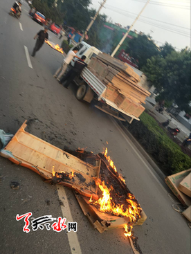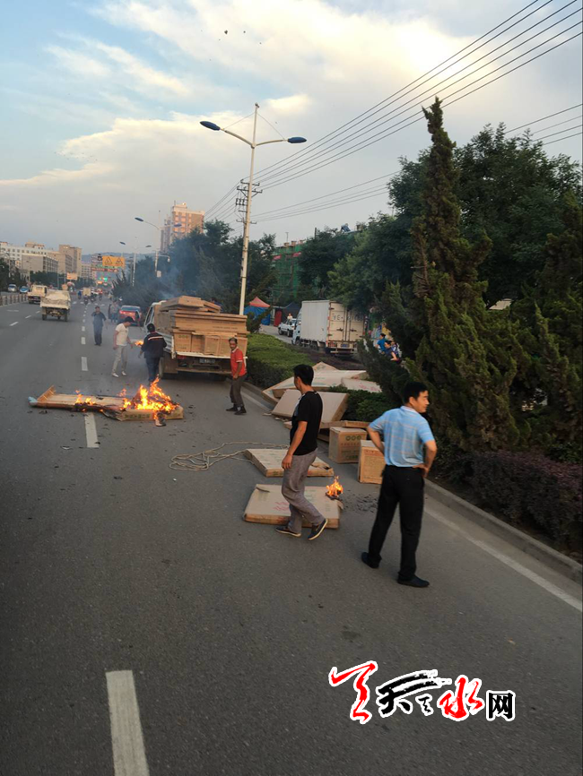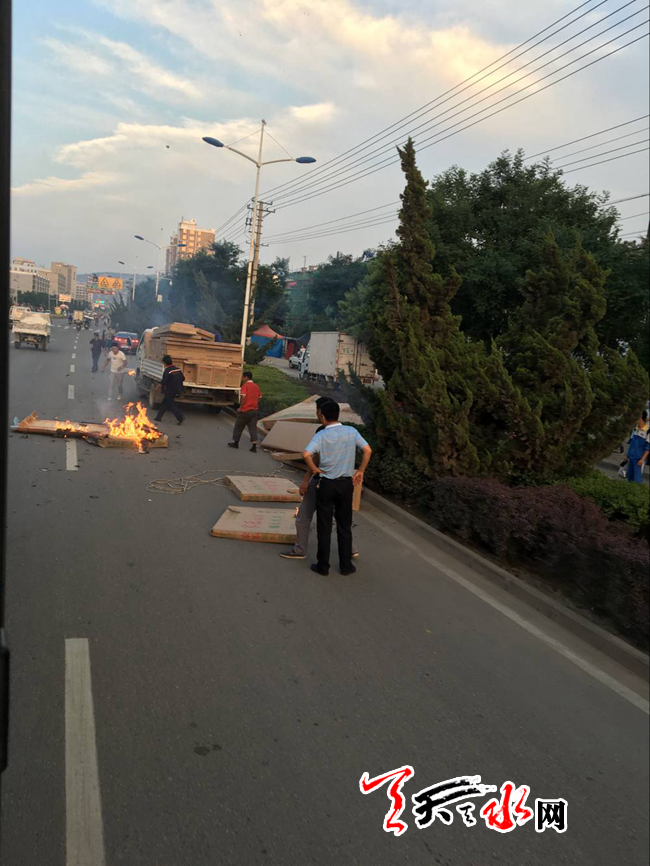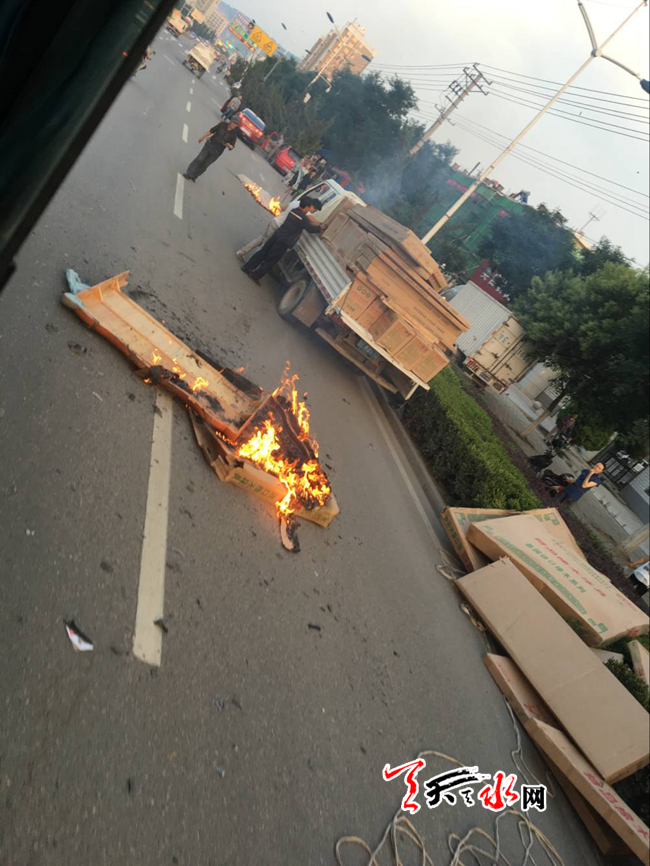 天天天水网19时50分讯【记者 裴婷婷】6月13日19时50分左右,在麦积区卷烟厂附近的马路上,一辆载着货物的小货车停靠在路边,马路一旁散落的货物有的不时冒出火星,有的正在燃烧。司机一边忙着将车上的货物拉往车下,一边忙着招呼人灭火。