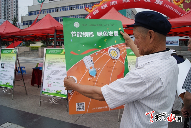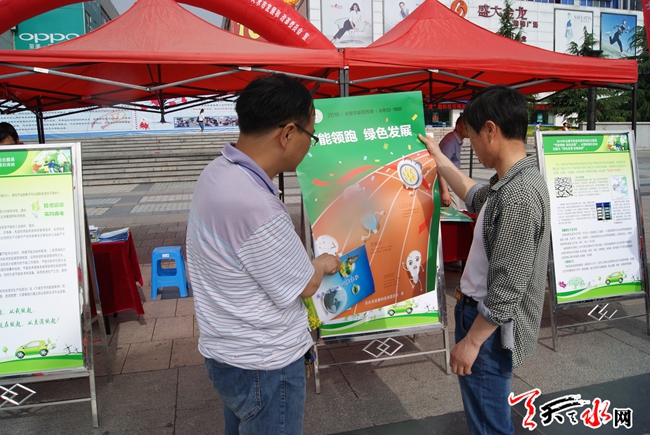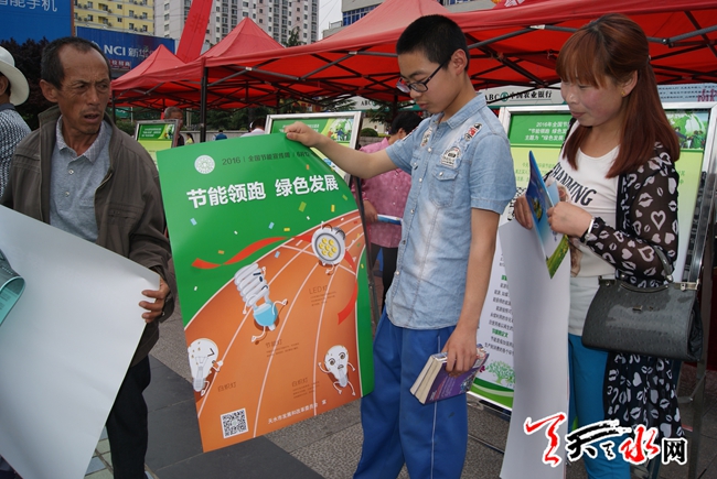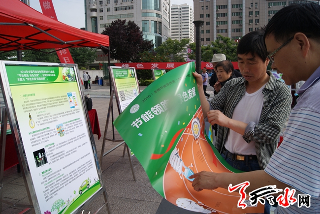 天天天水网14日11时讯 【记者 姬旺芳】6月14日,是全国低碳日。今年全国低碳日的主题为“绿色发展 低碳创新”。当天,市发改委在市区龙城广场举行节能宣传活动,增强全民节能低碳意识,倡导节能低碳的生产、生活方式和消费模式,在全社会树立和普及绿色发展理念。市委常委、副市长张明泰参加了宣传活动。图为市民在看节能减排,低碳生活宣传画。