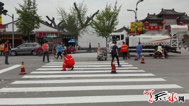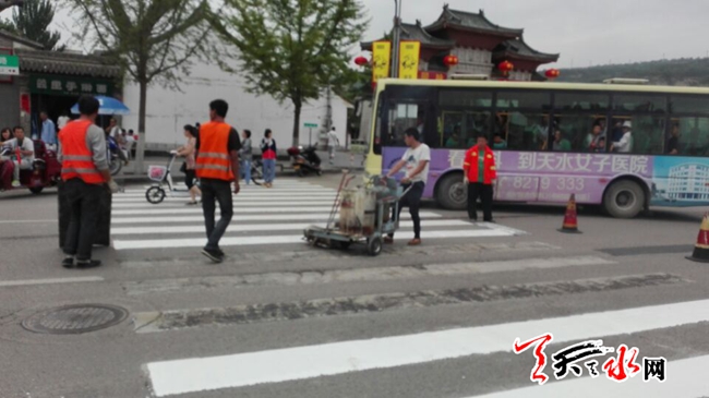 天天天水网14日15时讯 【记者 王雪梅】 6月14日,记者在伏羲庙门口十字路口看到,几名工人正在对该路段的斑马线进行刷新,更好地提醒车辆和行人安全。