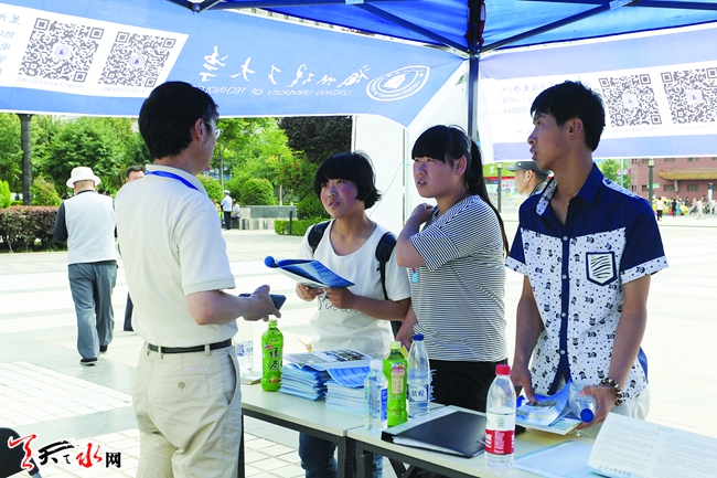 6月15日,由《甘肃日报》主办,兰州理工大学、甘肃农业大学、兰州财经大学、甘肃政法学院等近20家省内知名院校参与的“行进陇原 服务高考”2016高校招生全省巡回推介走进天水龙城广场,现场向我市的考生和家长宣传今年的高考改革新政、招生政策及院校热门专业、报考要求等信息。同时,现场发放了《2016高考报考指南》,受到学生和家长的欢迎。(天水日报记者 周文涛 邵兰霞 摄)