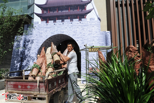 5月16日,随着节会的临近,秦州区祖脉文化展演展示活动也已开始布展。图为工作人员正在搬运布置会场所需的花草。(天水日报记者 周文涛 摄)