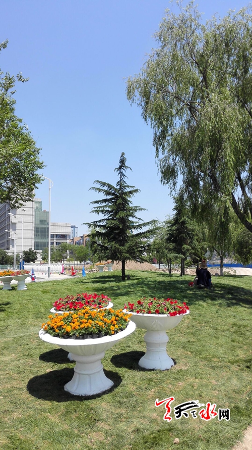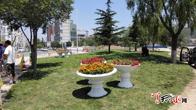 天天天水网17日17时讯 【记者 刘晓亚】6月17日,新建成的罗玉桥西端一片草坪和花坛相映成辉,为刚刚通车的新桥频添了一道靓丽的风景。